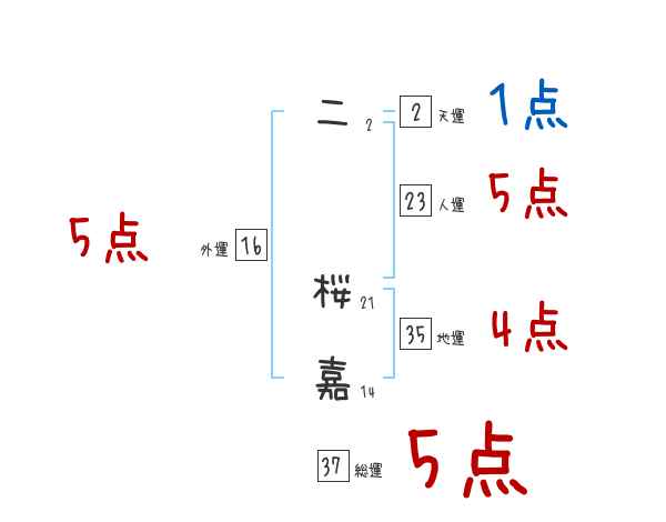 人運![]() | 二桜嘉さんの人運は23画の5つ星!想像力に優れ活力がある。一代で成功し名誉を手に入れる。 性格や才能などを表す2番目に重要な運勢です。人間関係や協調性、社会的な成功に影響します。主に20歳から50歳ぐらいまでの中年期の運勢を表します。 |