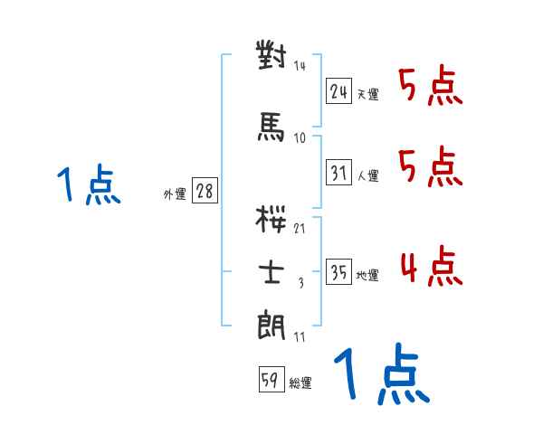 人運![]() | 對馬桜士朗さんの人運は31画の5つ星!社交性があり判断力に優れる。順風満帆な人生で円満な生活。 性格や才能などを表す2番目に重要な運勢です。人間関係や協調性、社会的な成功に影響します。主に20歳から50歳ぐらいまでの中年期の運勢を表します。 |