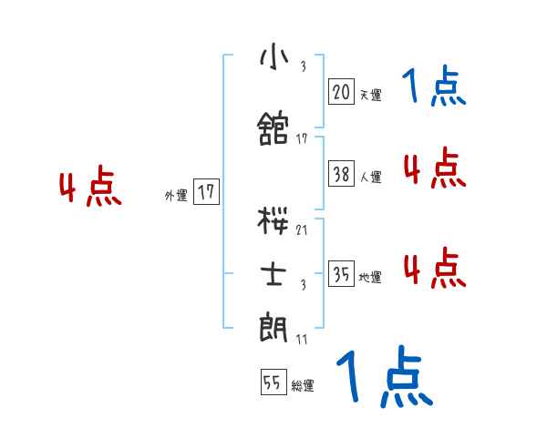 外運![]() | 小舘桜士朗さんの外運は17画の4つ星!積極的な行動力。地位を気づき財産を手に入れる。純粋な心と直感力。 生活面を象徴する運勢です。外部から受ける影響力を表し、結婚運、家庭運や職場、環境への順応性を表します。 |
