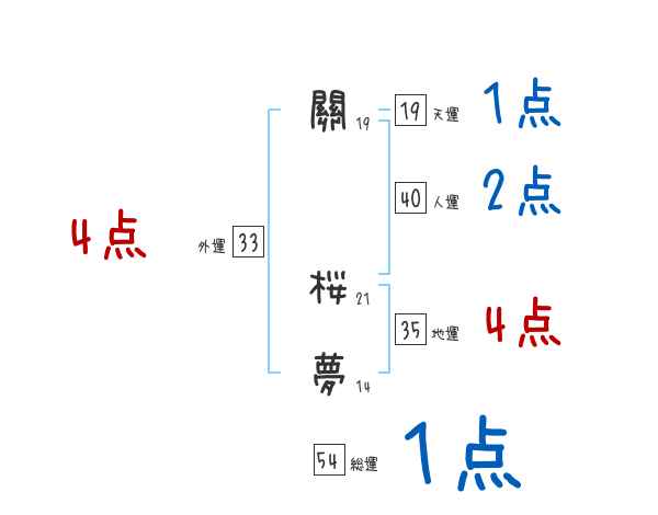 天運![]() | 關桜夢さんの天運は19画の1つ星!優れた才能を持ちますが、協調性が足りないことも。周りの人と協力する事を意識しましょう。 家系が持つ宿命的な運勢を表します。祖先から受け継いだ苗字ですので自分の力が及びません。家柄を象徴します。 |