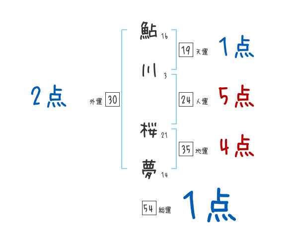 総運![]() | 鮎川桜夢さんの総運は54画の1つ星!トラブルが多いかも。周りをよく見て協調して過ごしましょう。 あなたの人生を表す1番重要な運勢です。生涯を通じて影響する総合運となり、主に50歳以降の晩年期に影響を及ぼします。 |