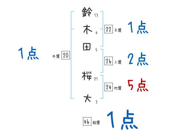 天運![]() | 鈴木田桜大さんの天運は22画の1つ星!努力することが苦手ないっぽう手先が器用。芸術性にも優れる。 家系が持つ宿命的な運勢を表します。祖先から受け継いだ苗字ですので自分の力が及びません。家柄を象徴します。 |