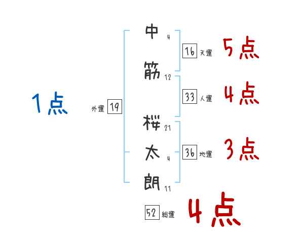 天運![]() | 中筋桜太朗さんの天運は16画の5つ星!人望が厚く大きく発展する。逆転成功が見える。 家系が持つ宿命的な運勢を表します。祖先から受け継いだ苗字ですので自分の力が及びません。家柄を象徴します。 |
