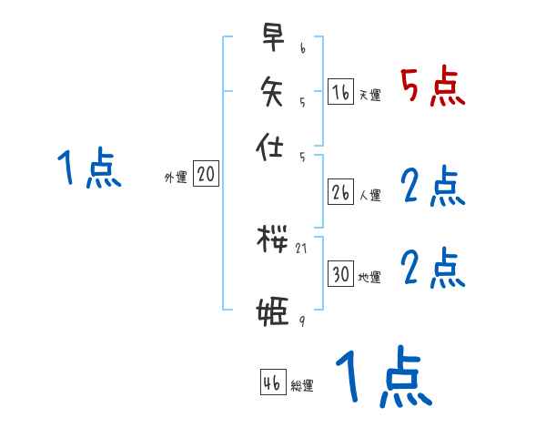 天運![]() | 早矢仕桜姫さんの天運は16画の5つ星!人望が厚く大きく発展する。逆転成功が見える。 家系が持つ宿命的な運勢を表します。祖先から受け継いだ苗字ですので自分の力が及びません。家柄を象徴します。 |