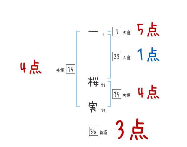 天運![]() | 一桜実さんの天運は1画の5つ星!行動力、指導力があり出世し繁栄する。幸運に恵まれる。 家系が持つ宿命的な運勢を表します。祖先から受け継いだ苗字ですので自分の力が及びません。家柄を象徴します。 |
