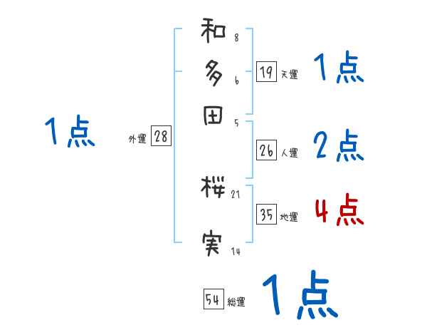 外運![]() | 和多田桜実さんの外運は28画の1つ星!家庭環境に注意。スポーツで活躍できる能力があるかも。 生活面を象徴する運勢です。外部から受ける影響力を表し、結婚運、家庭運や職場、環境への順応性を表します。 |