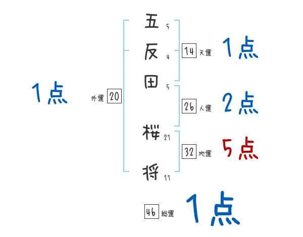 総運![]() | 五反田桜将さんの総運は46画の1つ星!迷走することが多く苦労するかも。目先のことにとらわれないように。 あなたの人生を表す1番重要な運勢です。生涯を通じて影響する総合運となり、主に50歳以降の晩年期に影響を及ぼします。 |