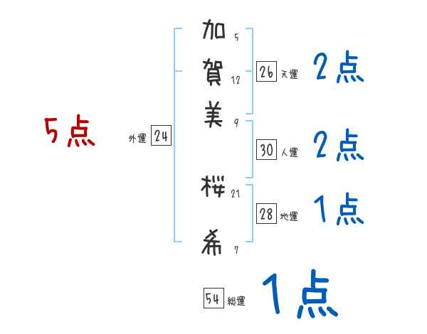総運![]() | 加賀美桜希さんの総運は54画の1つ星!トラブルが多いかも。周りをよく見て協調して過ごしましょう。 あなたの人生を表す1番重要な運勢です。生涯を通じて影響する総合運となり、主に50歳以降の晩年期に影響を及ぼします。 |