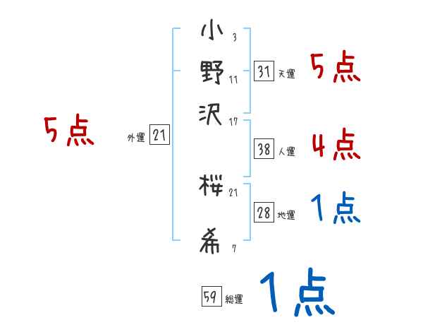 外運![]() | 小野沢桜希さんの外運は21画の5つ星!統率力がある。独立し成功する。名誉を手に入れる。 生活面を象徴する運勢です。外部から受ける影響力を表し、結婚運、家庭運や職場、環境への順応性を表します。 |