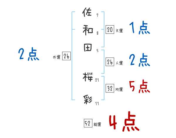 外運![]() | 佐和田桜彩さんの外運は26画の2つ星!波瀾万丈かも。信頼できる人を大事にしましょう。 生活面を象徴する運勢です。外部から受ける影響力を表し、結婚運、家庭運や職場、環境への順応性を表します。 |