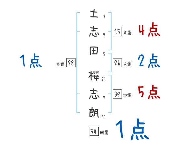 総運![]() | 土志田桜志朗さんの総運は54画の1つ星!トラブルが多いかも。周りをよく見て協調して過ごしましょう。 あなたの人生を表す1番重要な運勢です。生涯を通じて影響する総合運となり、主に50歳以降の晩年期に影響を及ぼします。 |
