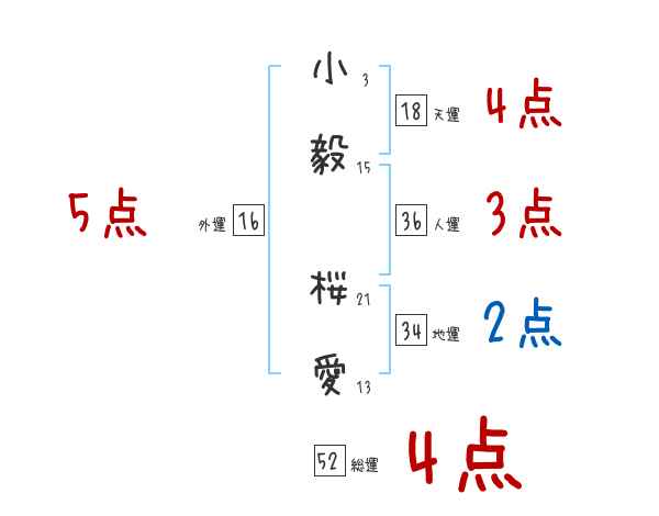 人運![]() | 小毅桜愛さんの人運は36画の3つ星!先見性が豊かです。多少神経質で苦労することも。 性格や才能などを表す2番目に重要な運勢です。人間関係や協調性、社会的な成功に影響します。主に20歳から50歳ぐらいまでの中年期の運勢を表します。 |