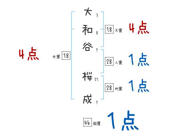 天運![]() | 大和谷桜成さんの天運は18画の4つ星!情熱的で剛気。忍耐力があり信頼される。 家系が持つ宿命的な運勢を表します。祖先から受け継いだ苗字ですので自分の力が及びません。家柄を象徴します。 |