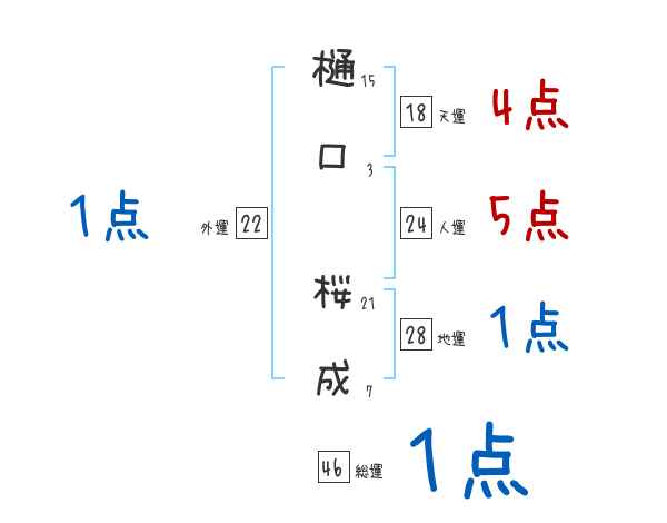 総運![]() | 樋口桜成さんの総運は46画の1つ星!迷走することが多く苦労するかも。目先のことにとらわれないように。 あなたの人生を表す1番重要な運勢です。生涯を通じて影響する総合運となり、主に50歳以降の晩年期に影響を及ぼします。 |