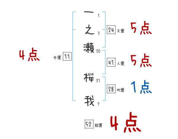 外運![]() | 一之瀬桜我さんの外運は11画の4つ星!着実に富や地位を得る幸運な人生。 生活面を象徴する運勢です。外部から受ける影響力を表し、結婚運、家庭運や職場、環境への順応性を表します。 |