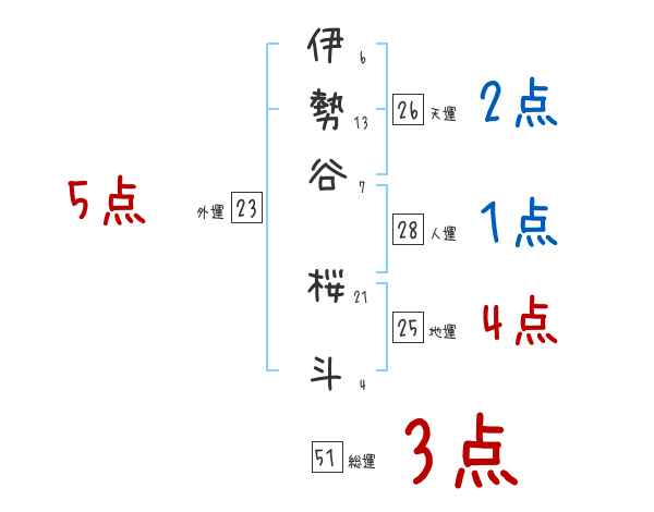 外運![]() | 伊勢谷桜斗さんの外運は23画の5つ星!想像力に優れ活力がある。一代で成功し名誉を手に入れる。 生活面を象徴する運勢です。外部から受ける影響力を表し、結婚運、家庭運や職場、環境への順応性を表します。 |