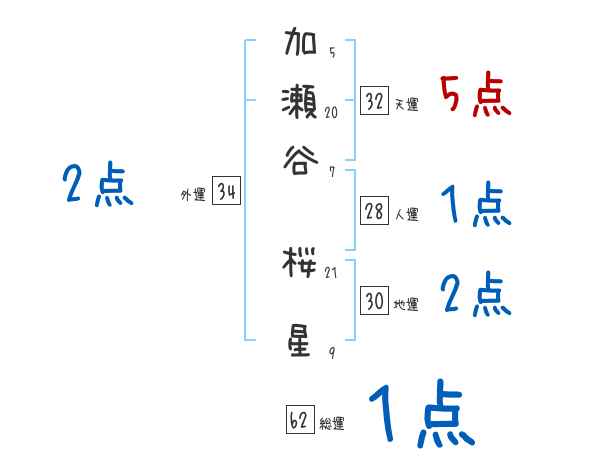 天運![]() | 加瀬谷桜星さんの天運は32画の5つ星!柔軟性があり成功する。チャンスが多く金運が良い。 家系が持つ宿命的な運勢を表します。祖先から受け継いだ苗字ですので自分の力が及びません。家柄を象徴します。 |