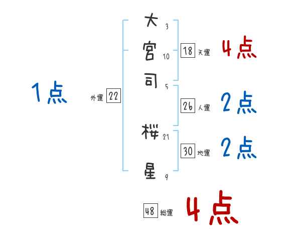 天運![]() | 大宮司桜星さんの天運は18画の4つ星!情熱的で剛気。忍耐力があり信頼される。 家系が持つ宿命的な運勢を表します。祖先から受け継いだ苗字ですので自分の力が及びません。家柄を象徴します。 |