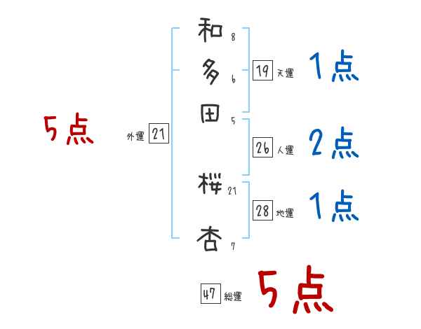 総運![]() | 和多田桜杏さんの総運は47画の5つ星!実力が開花し発展する円満な人生。財に恵まれる。 あなたの人生を表す1番重要な運勢です。生涯を通じて影響する総合運となり、主に50歳以降の晩年期に影響を及ぼします。 |