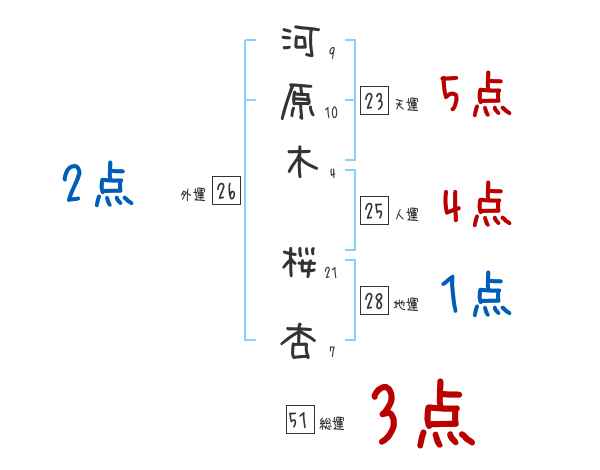 外運![]() | 河原木桜杏さんの外運は26画の2つ星!波瀾万丈かも。信頼できる人を大事にしましょう。 生活面を象徴する運勢です。外部から受ける影響力を表し、結婚運、家庭運や職場、環境への順応性を表します。 |