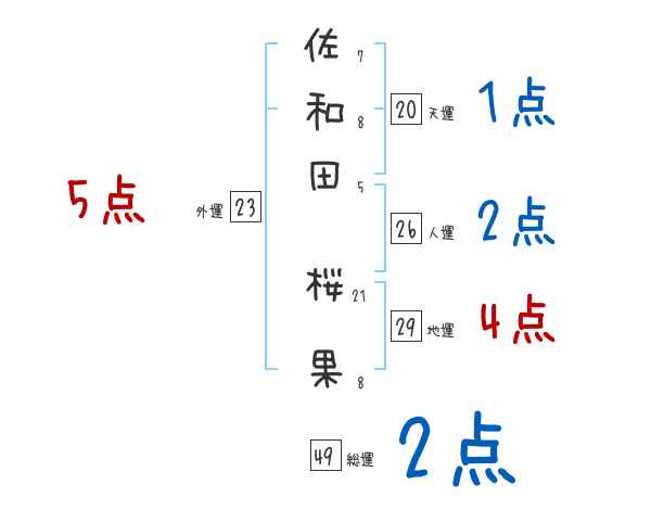 外運![]() | 佐和田桜果さんの外運は23画の5つ星!想像力に優れ活力がある。一代で成功し名誉を手に入れる。 生活面を象徴する運勢です。外部から受ける影響力を表し、結婚運、家庭運や職場、環境への順応性を表します。 |