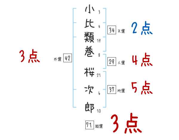 外運![]() | 小比類巻桜次郎さんの外運は42画の3つ星!病気に注意。多芸であるが消極的でおとなしい。 生活面を象徴する運勢です。外部から受ける影響力を表し、結婚運、家庭運や職場、環境への順応性を表します。 |