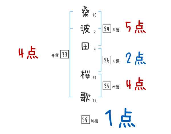 天運![]() | 桑波田桜歌さんの天運は24画の5つ星!家庭運が良く順調な人生。金運にも恵まれる。 家系が持つ宿命的な運勢を表します。祖先から受け継いだ苗字ですので自分の力が及びません。家柄を象徴します。 |
