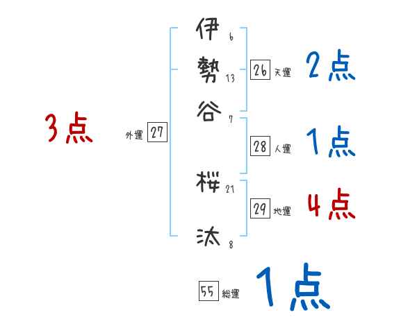 天運![]() | 伊勢谷桜汰さんの天運は26画の2つ星!波瀾万丈かも。信頼できる人を大事にしましょう。 家系が持つ宿命的な運勢を表します。祖先から受け継いだ苗字ですので自分の力が及びません。家柄を象徴します。 |