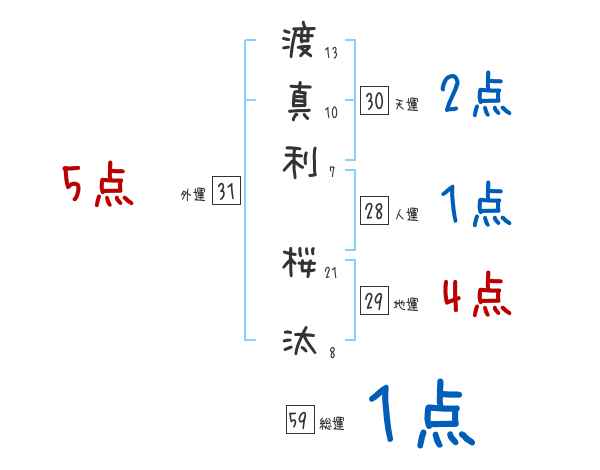 天運![]() | 渡真利桜汰さんの天運は30画の2つ星!浮き沈みの激しさに注意しましょう。 家系が持つ宿命的な運勢を表します。祖先から受け継いだ苗字ですので自分の力が及びません。家柄を象徴します。 |