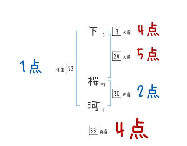 天運![]() | 下桜河さんの天運は3画の4つ星!活動的で才能に恵まれ、多くの信頼を得る。希望に満ち成長する。 家系が持つ宿命的な運勢を表します。祖先から受け継いだ苗字ですので自分の力が及びません。家柄を象徴します。 |