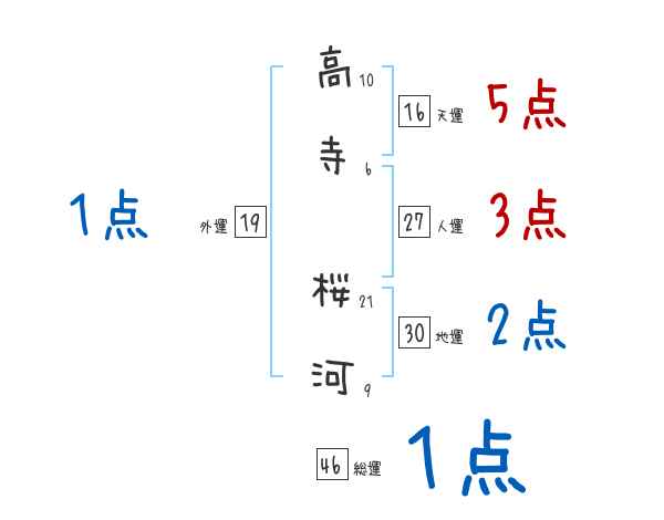 天運![]() | 高寺桜河さんの天運は16画の5つ星!人望が厚く大きく発展する。逆転成功が見える。 家系が持つ宿命的な運勢を表します。祖先から受け継いだ苗字ですので自分の力が及びません。家柄を象徴します。 |