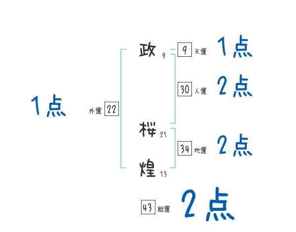 天運![]() | 政桜煌さんの天運は9画の1つ星!消極的で才能を発揮することが苦手なことも。周りの意見に耳を傾けましょう。 家系が持つ宿命的な運勢を表します。祖先から受け継いだ苗字ですので自分の力が及びません。家柄を象徴します。 |