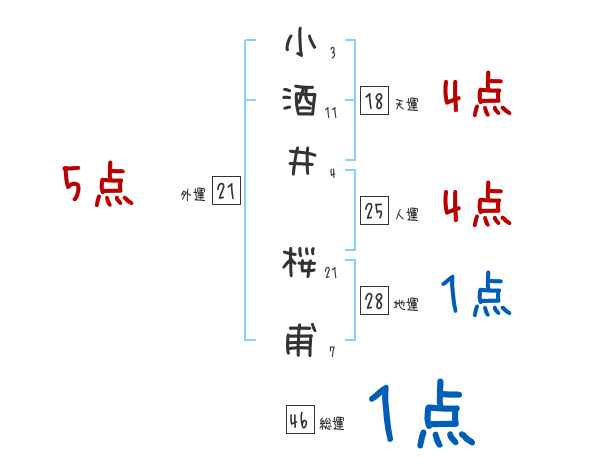 外運![]() | 小酒井桜甫さんの外運は21画の5つ星!統率力がある。独立し成功する。名誉を手に入れる。 生活面を象徴する運勢です。外部から受ける影響力を表し、結婚運、家庭運や職場、環境への順応性を表します。 |