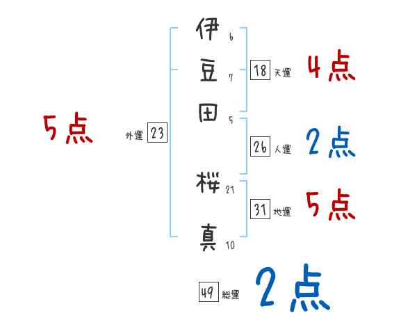 外運![]() | 伊豆田桜真さんの外運は23画の5つ星!想像力に優れ活力がある。一代で成功し名誉を手に入れる。 生活面を象徴する運勢です。外部から受ける影響力を表し、結婚運、家庭運や職場、環境への順応性を表します。 |
