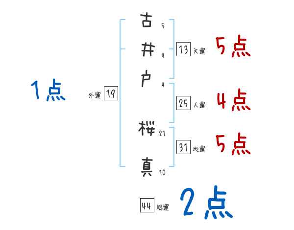 総運![]() | 古井戸桜真さんの総運は44画の2つ星!誠実で慎重な性格。物事を考えすぎないように注意しましょう。 あなたの人生を表す1番重要な運勢です。生涯を通じて影響する総合運となり、主に50歳以降の晩年期に影響を及ぼします。 |