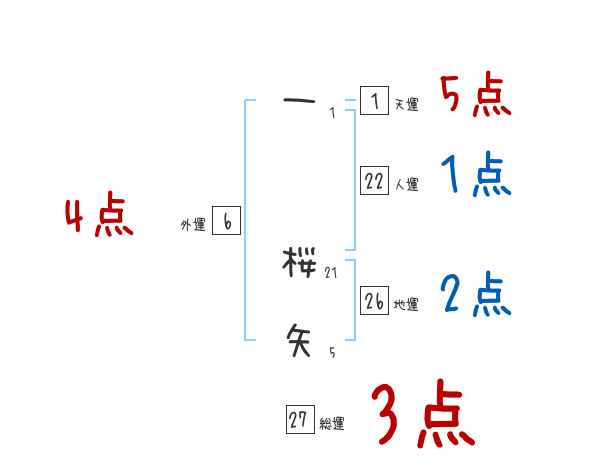 天運![]() | 一桜矢さんの天運は1画の5つ星!行動力、指導力があり出世し繁栄する。幸運に恵まれる。 家系が持つ宿命的な運勢を表します。祖先から受け継いだ苗字ですので自分の力が及びません。家柄を象徴します。 |