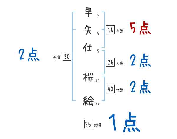 天運![]() | 早矢仕桜絵さんの天運は16画の5つ星!人望が厚く大きく発展する。逆転成功が見える。 家系が持つ宿命的な運勢を表します。祖先から受け継いだ苗字ですので自分の力が及びません。家柄を象徴します。 |