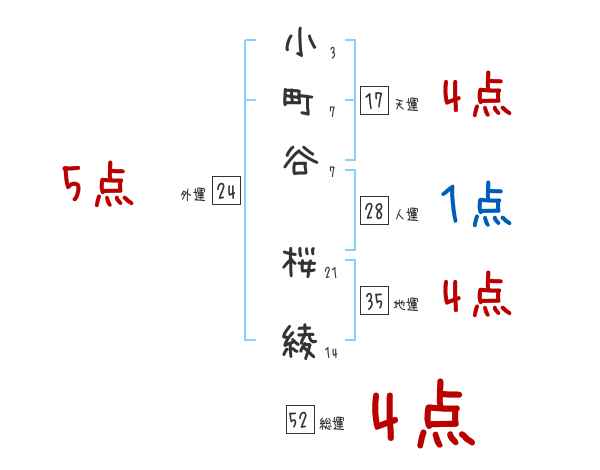 外運![]() | 小町谷桜綾さんの外運は24画の5つ星!家庭運が良く順調な人生。金運にも恵まれる。 生活面を象徴する運勢です。外部から受ける影響力を表し、結婚運、家庭運や職場、環境への順応性を表します。 |
