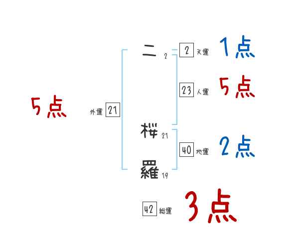 外運![]() | 二桜羅さんの外運は21画の5つ星!統率力がある。独立し成功する。名誉を手に入れる。 生活面を象徴する運勢です。外部から受ける影響力を表し、結婚運、家庭運や職場、環境への順応性を表します。 |