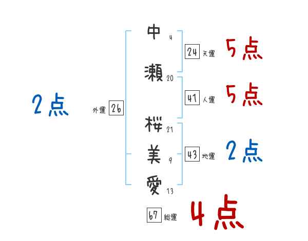 天運![]() | 中瀬桜美愛さんの天運は24画の5つ星!家庭運が良く順調な人生。金運にも恵まれる。 家系が持つ宿命的な運勢を表します。祖先から受け継いだ苗字ですので自分の力が及びません。家柄を象徴します。 |