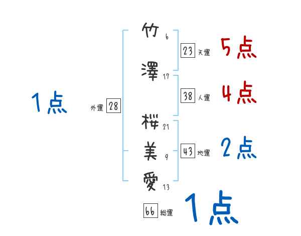 天運![]() | 竹澤桜美愛さんの天運は23画の5つ星!想像力に優れ活力がある。一代で成功し名誉を手に入れる。 家系が持つ宿命的な運勢を表します。祖先から受け継いだ苗字ですので自分の力が及びません。家柄を象徴します。 |
