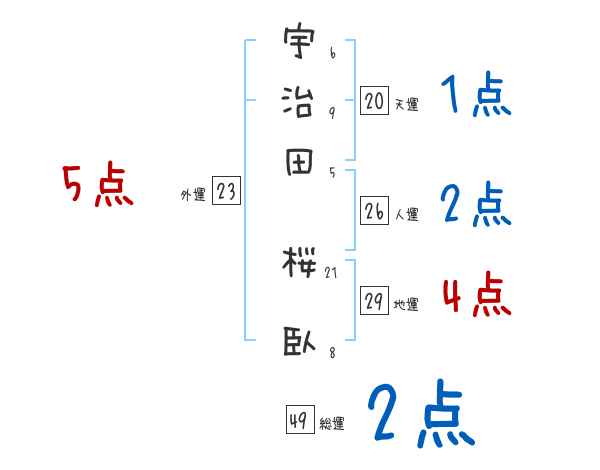 外運![]() | 宇治田桜臥さんの外運は23画の5つ星!想像力に優れ活力がある。一代で成功し名誉を手に入れる。 生活面を象徴する運勢です。外部から受ける影響力を表し、結婚運、家庭運や職場、環境への順応性を表します。 |