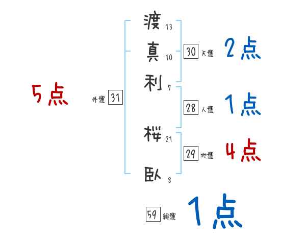 天運![]() | 渡真利桜臥さんの天運は30画の2つ星!浮き沈みの激しさに注意しましょう。 家系が持つ宿命的な運勢を表します。祖先から受け継いだ苗字ですので自分の力が及びません。家柄を象徴します。 |