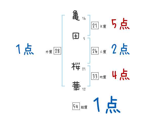 外運![]() | 亀田桜華さんの外運は28画の1つ星!家庭環境に注意。スポーツで活躍できる能力があるかも。 生活面を象徴する運勢です。外部から受ける影響力を表し、結婚運、家庭運や職場、環境への順応性を表します。 |