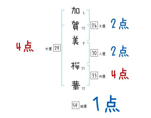 | 天運  | 加賀美桜華さんの天運は26画の2つ星!波瀾万丈かも。信頼できる人を大事にしましょう。家系が持つ宿命的な運勢を表します。祖先から受け継いだ苗字ですので自分の力が及びません。家柄を象徴します。 |