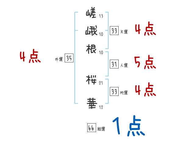 外運![]() | 嵯峨根桜華さんの外運は35画の4つ星!温厚な性格で感受性が高い。穏和な性格で人望が厚い。 生活面を象徴する運勢です。外部から受ける影響力を表し、結婚運、家庭運や職場、環境への順応性を表します。 |