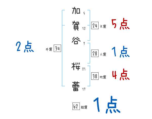 天運![]() | 加賀谷桜蕾さんの天運は24画の5つ星!家庭運が良く順調な人生。金運にも恵まれる。 家系が持つ宿命的な運勢を表します。祖先から受け継いだ苗字ですので自分の力が及びません。家柄を象徴します。 |