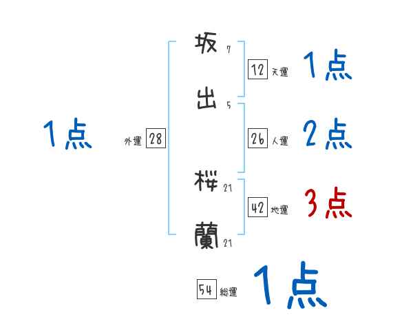 地運![]() | 坂出桜蘭さんの地運は42画の3つ星!病気に注意。多芸であるが消極的でおとなしい。 個性を表す基礎的な運勢です。性格形成や対人関係、行動力など家庭環境に影響されます。主に誕生してから20歳くらいまでの若年期の運勢を表します。 |