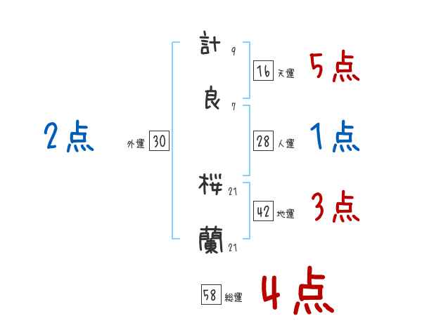天運![]() | 計良桜蘭さんの天運は16画の5つ星!人望が厚く大きく発展する。逆転成功が見える。 家系が持つ宿命的な運勢を表します。祖先から受け継いだ苗字ですので自分の力が及びません。家柄を象徴します。 |