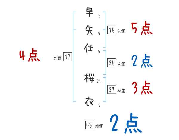 天運![]() | 早矢仕桜衣さんの天運は16画の5つ星!人望が厚く大きく発展する。逆転成功が見える。 家系が持つ宿命的な運勢を表します。祖先から受け継いだ苗字ですので自分の力が及びません。家柄を象徴します。 |